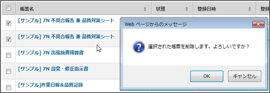 • 項目の削除 一覧の項目を選択して削除できます。次の例は、「入力帳票」の一覧から2点を選んで削除を実行している例です。削除前に確認ダイアログが表示されます。