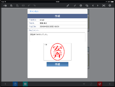 アプリで作成クラスターをタップすると、ポップアップでログイン中のユーザー情報、コメント、印影またはサイン記入欄が表示され、登録すると印影またはサインが表示されます。