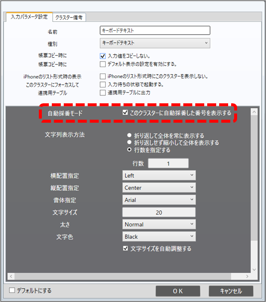 「このクラスターに自動採番した番号を表示する」にチェックを付けることで、自動採番機能で採番された番号を、本クラスターに表示します。