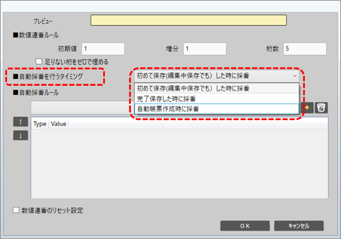 自動採番されるタイミングは自動採番ルール画面で予め設定した「自動採番を行うタイミング」に従います。「初めて保存(編集中保存でも)した時に採番」「完了保存した時に採番」「自動帳票作成時に採番」から選択します。