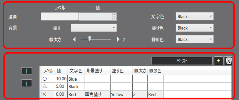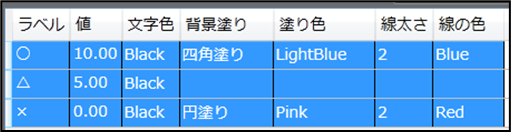 ※塗り色を設定しない事で透過の円や四角を設定できます。 ラベルは設定必須ですが、ラベルに何も表示させたくない場合は全角スペースを設定して下さい。また、ラベルは一意制約があるため、複数の項目でラベルに何も表示させたくない場合は、全角スペースの数により一意制約を満たすよう調整をお願い致します。