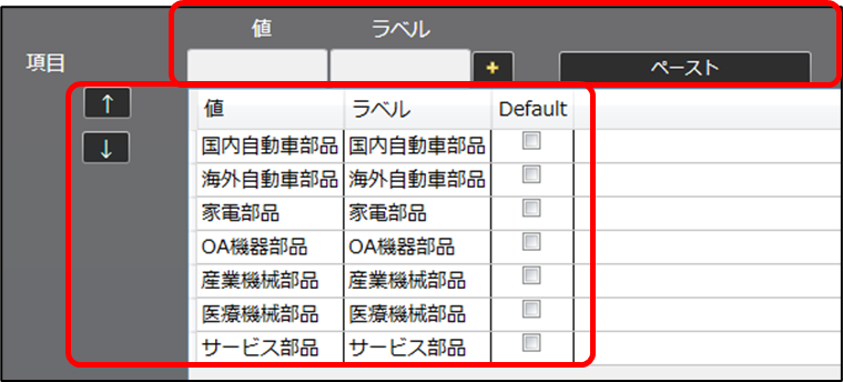 主にシステム用の文字列を指定しますが、ラベルと同じ文字列を扱う場合や、連携用の指定が無い場合は、値にラベルで使う文字列を入力してEnterキー、または\[+]ボタンで確定すると、同じ文字列がラベルにも自動で入力されて選択肢として登録されます。