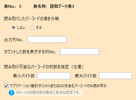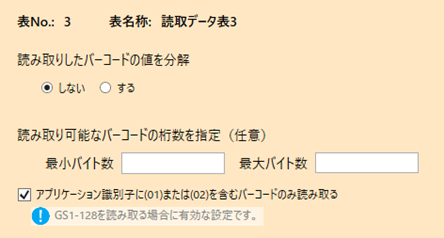 バーコードの種類として「Code128」を設定した場合のみ本設定が表示されます。チェックを付けると、アプリケーション識別子(01)または(02)を含むバーコードのみを読み取り対象とします。