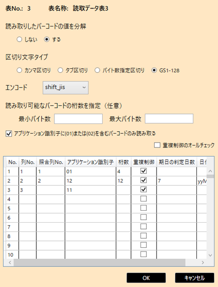 「同じバーコードを読み取る」場合の読取データ表の分解設定