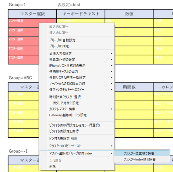 また、Designer編集画面にて、同じグループIDのマスター選択クラスターを複数個選択した状態で、右クリックメニューの「マスター選択のグループID内Index」から採番方法を選んで、グループID内Indexを自動採番(採番し直し)することができます。
