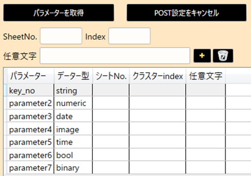 POST設定を行う場合は、取得した全てのパラメーターに対してクラスター(データー型がstringの場合はまたは任意文字)の登録が必須となります。