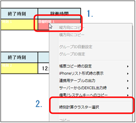 右クリックメニューから「時刻計算クラスター選択」を選択します。