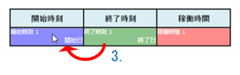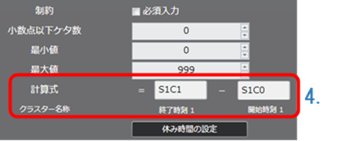 次の例の場合、「稼働時間 = 終了時刻 – 開始時刻」を計算するために、時刻計算クラスターの計算式を「= S1C1 - S1C0」と設定します。 「稼働時間 = 01:30 – 23:30」となります。