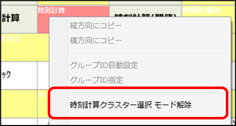 対象クラスターの選択を中止する場合は、右クリ ックメニューから「時刻計算クラスター選択 モー ド解除」を選択します。