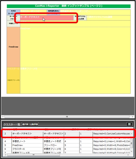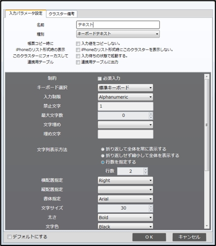 「入力パラメーター設定」では、クラスターの種別、入力に関する制限、書式などのパラメーターを設定することができます。 上部タブの切り替えで、クラスター備考も編集できます。