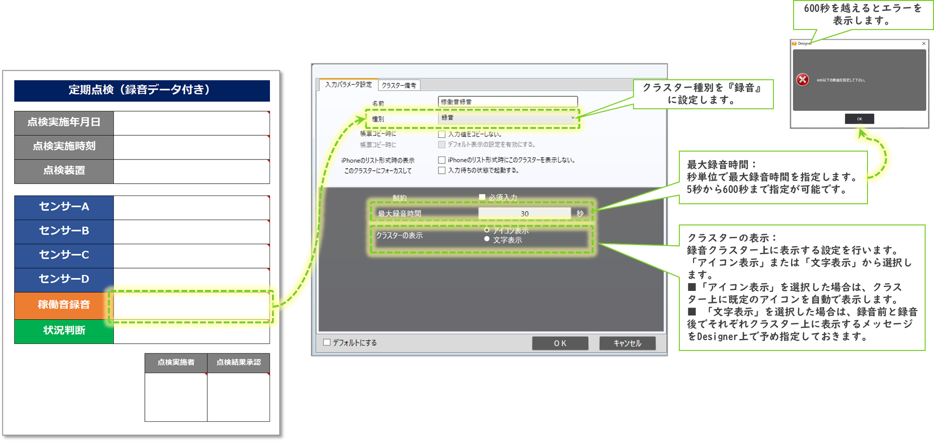 帳票上に配置したクラスターの種別を「録音」に設定し、録音時の各動作を指定します。