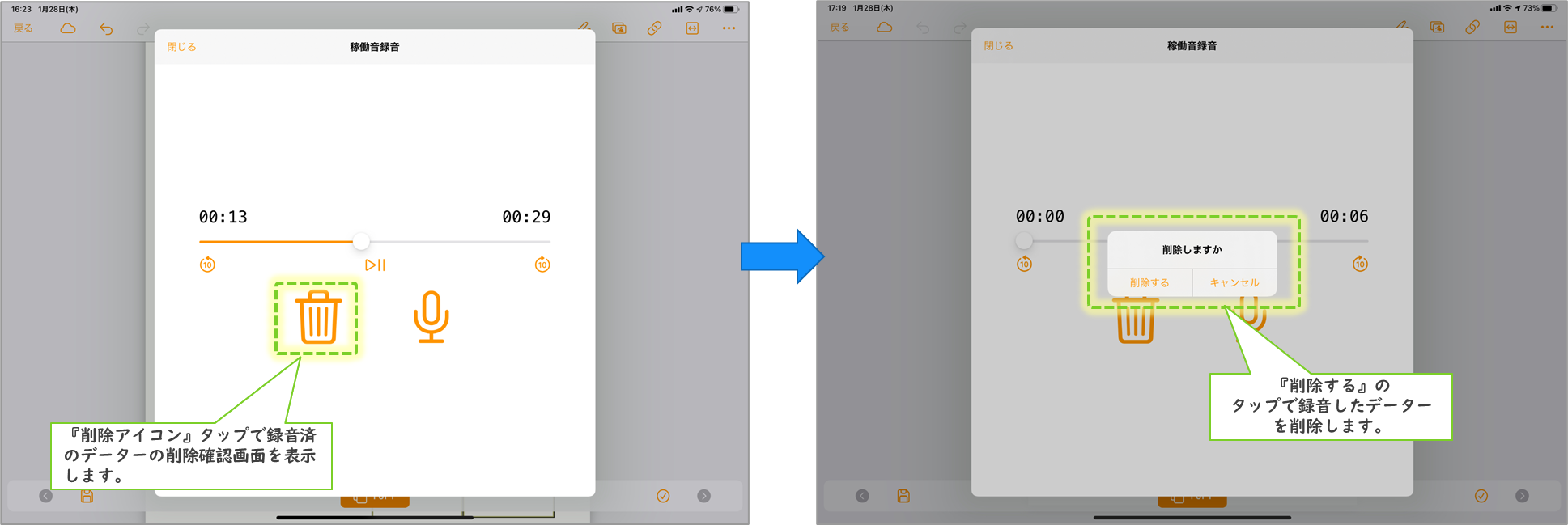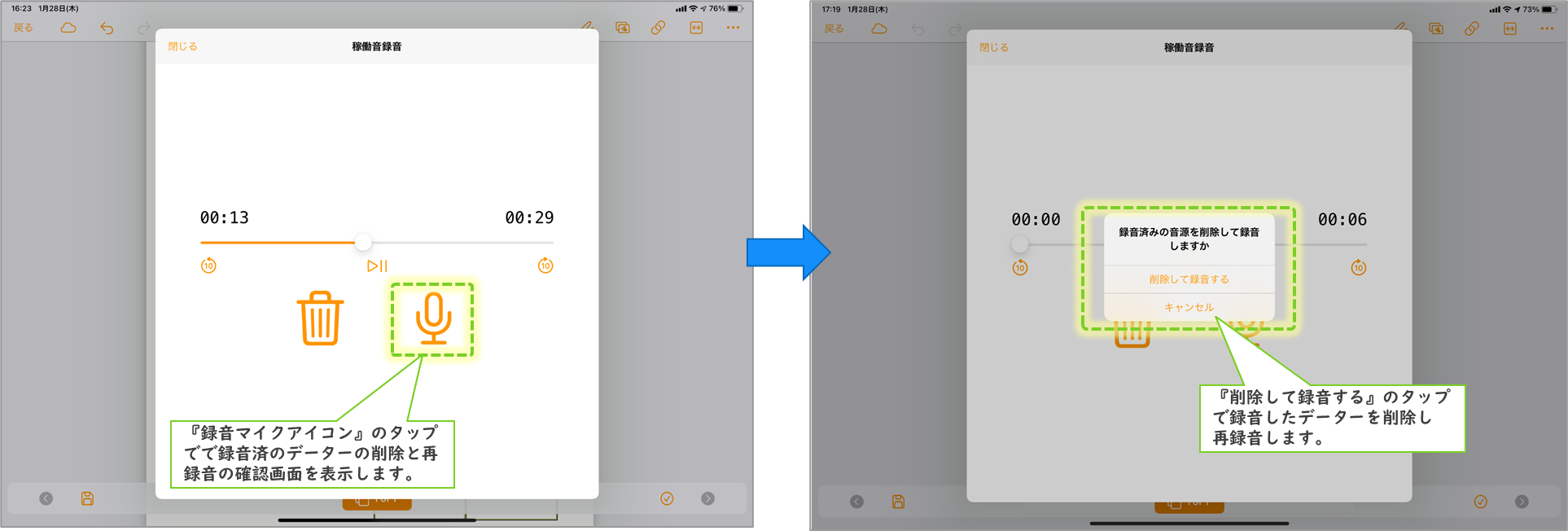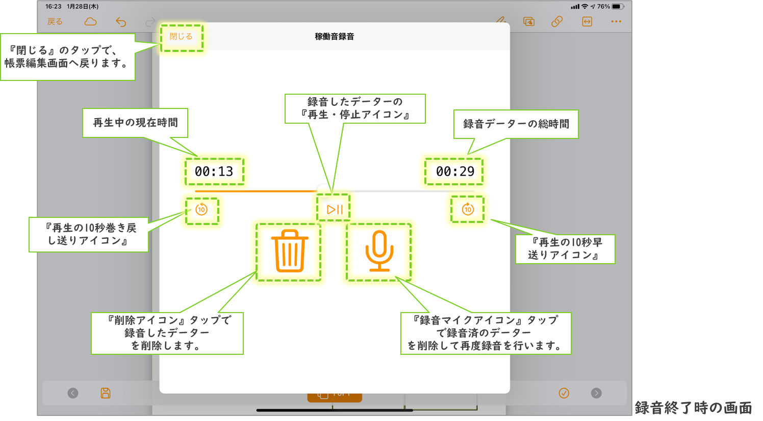 録音後は録音クラスターをタップすると、録音データーの再生、削除及び、再録音が可能です。