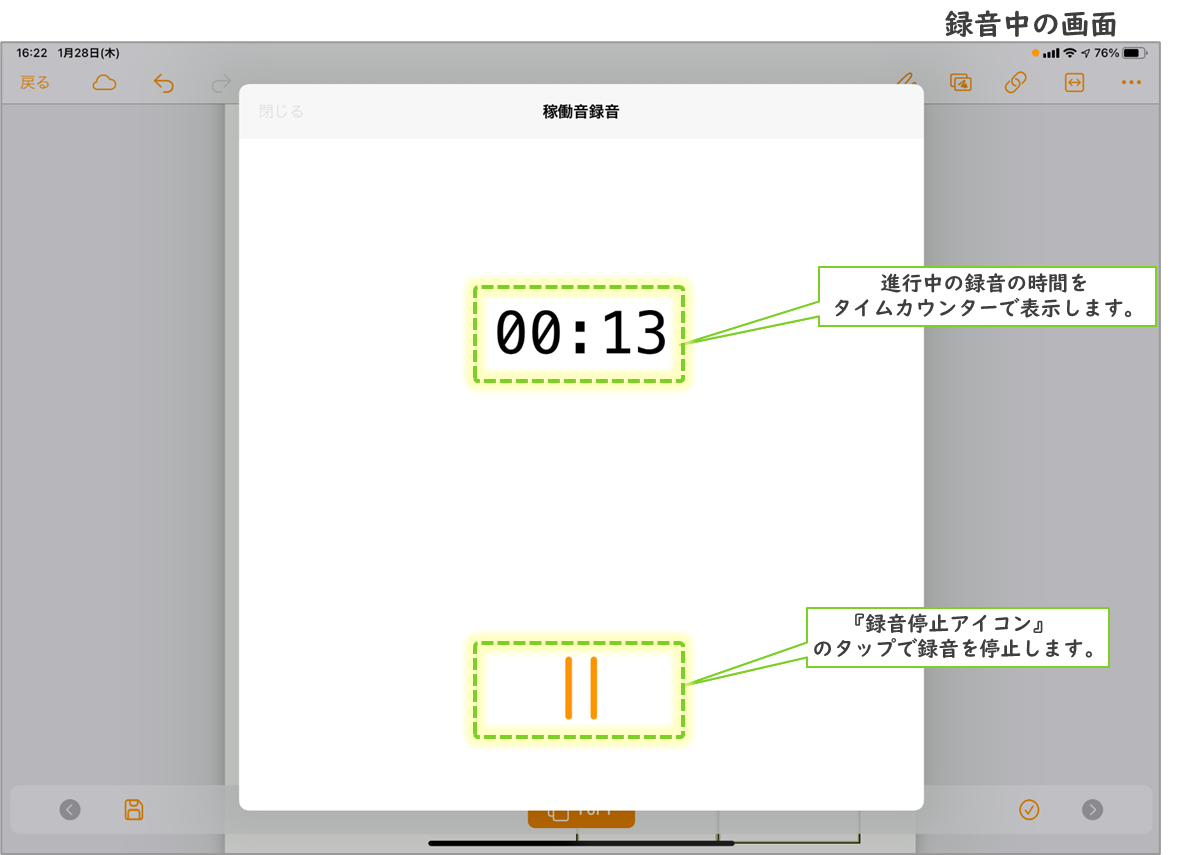 録音専用の画面の下部の「録音マイクアイコン」をタップし、録音を開始します。