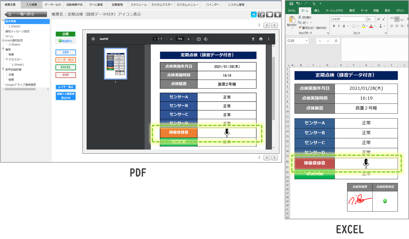 ConMas Managerから出力したPDF、EXCELにおいても、録音クラスターには、ConMas Designerでの設定に従い「アイコン表示」or「文字表示」されます。