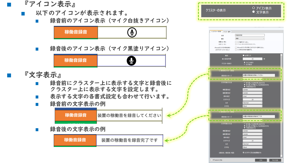 録音クラスター上に表示する設定を行います。 「アイコン表示」、「文字表示」から選択します。