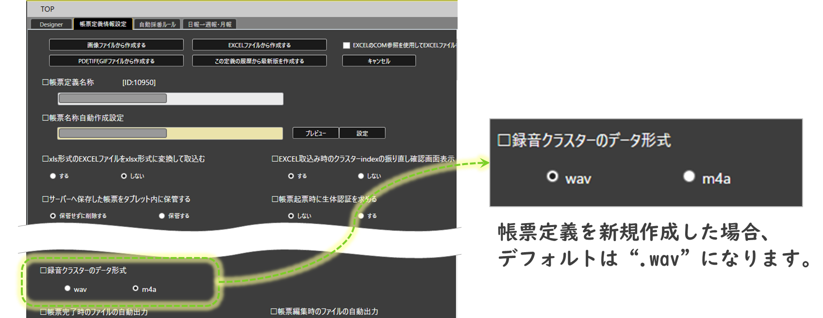 「帳票定義情報設定」画面で、録音時のデーター形式(フォーマット)を設定します。 「.wav」、「.m4a」のどちらかを選択します。