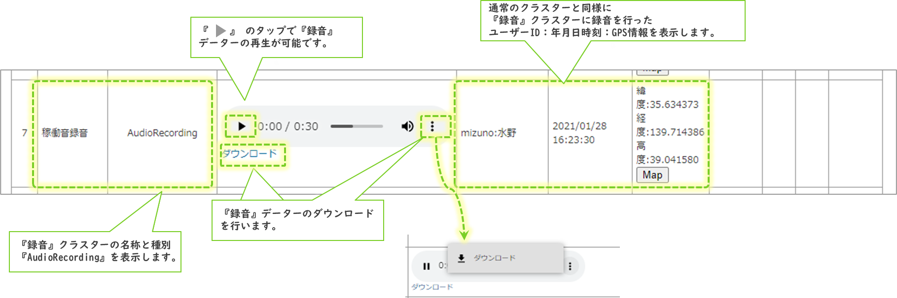 通常のクラスターと同様に、その録音をしたユーザーID、録音操作を開始した時間(年月日時分秒)、GPS情報の取得が可能です。