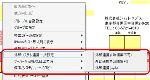 右クリックメニュー「外部システム連携一括設定」から、「外部連携する(編集不可)」「外部連携する(編集可)」「外部連携しない」のいずれかを選択します。