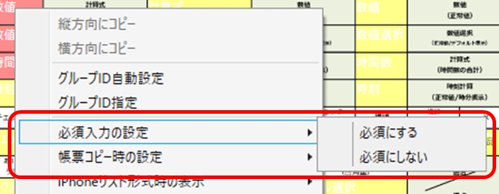 右クリックメニュー「必須入力の設定」から、「必須にする」「必須にしない」のいずれかを選択します。