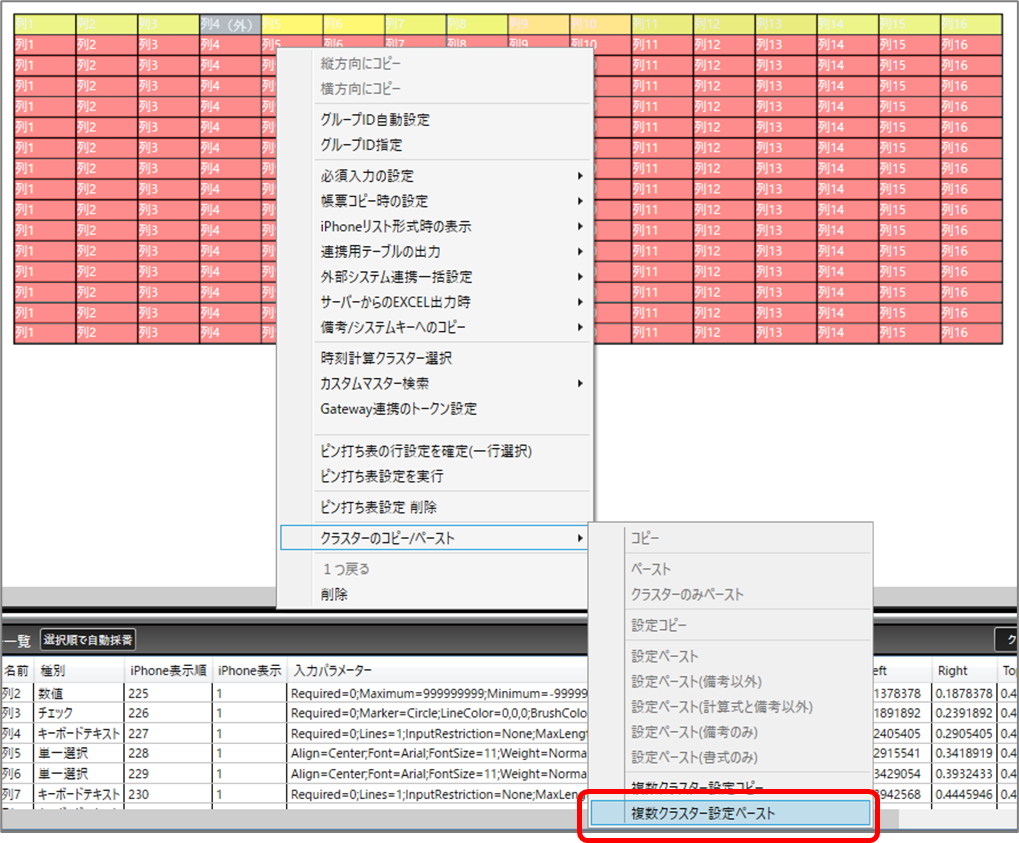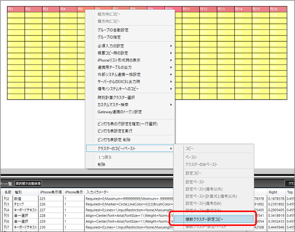 クラスターの入力パラメータ設定、および、ネットワーク設定、カーボンコピー設定、帳票コピー時移動設定、カスタムマスター親子設定、バーコード分解設定が行われた複数のクラスターをまとめて選択・コピーしてペーストすることが出来ます。表レイアウトのような帳票など、同じ設定を繰り返し行う必要がある場合に、これらの設定をまとめてコピー/ペーストする事が可能になります。