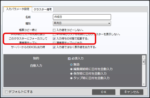 入力パラメータ設定の上部基本設定「このクラスターにフォーカスして入力待ちの状態で起動する。」をチェックすると、シートごとに、初めてそのシートが表示された時に、チェックしたクラスターを選択状態にします。
