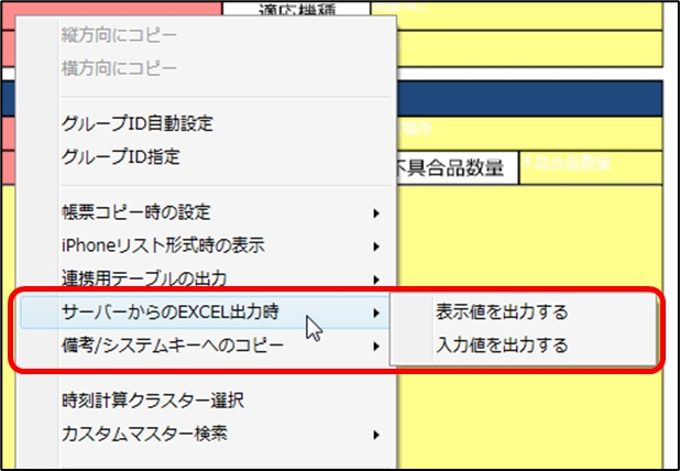 右クリックメニュー「サーバーからのEXCEL出力時」から、入力値/表示値を選択します。