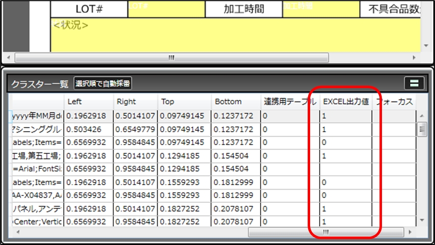 入力値/表示値の出力設定状況は、「クラスター一覧」グリッドの「EXCEL出力値」列に表示されます。それぞれ以下のような意味となります。