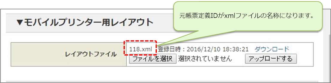 レイアウトxmlファイルはManagerからアップロードすると、自動でファイル名が元定義IDに変わります。帳票定義を更新してリビジョンが上がっても、以後このファイル名称は変わりません。