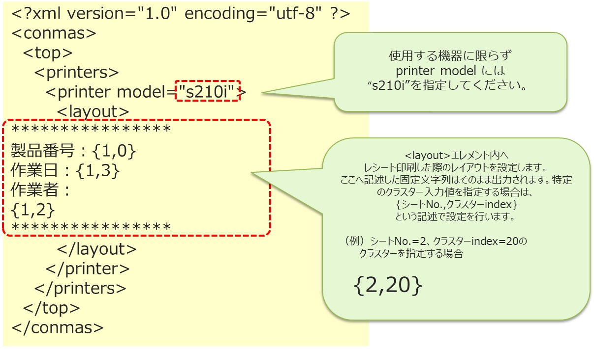 <?xml version="1.0" encoding="utf-8" ?> <conmas> <top> <printers> <printer model="s210i"> <layout> **************** 製品番号:{1,0} 作業日:{1,3} 作業者: {1,2} **************** </layout> </printer> </printers> </top> </conmas>