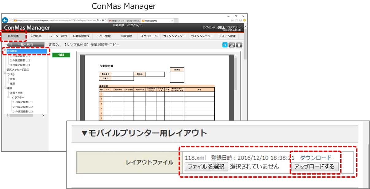 レシート印刷用のレイアウトxmlファイルはConMas Managerからアップロードを行います。 Manager上で帳票定義一覧から該当の帳票定義を選択して開き、基本情報内にあります「モバイルプリンター用レイアウト」にて「ファイルを選択」からレイアウトxmlファイルを選択し「アップロードする」を実行します。
