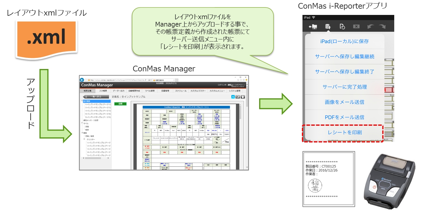 レシートのレイアウトはxmlファイルで指定を行い、レイアウトxmlファイルをConMas Manager からアップロードして頂くことで使用できるようになります。