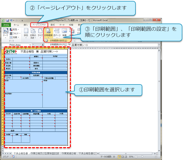 シートにレイアウトを作成し、セルへのクラスタ―設定が終了したら、印刷範囲の設定を行います。 各シートの印刷範囲で、帳票定義のシートが作成されます。