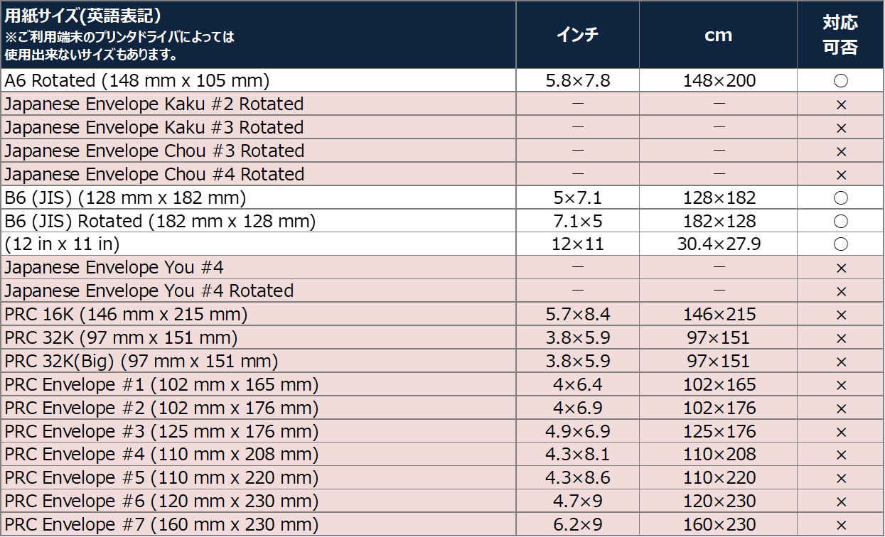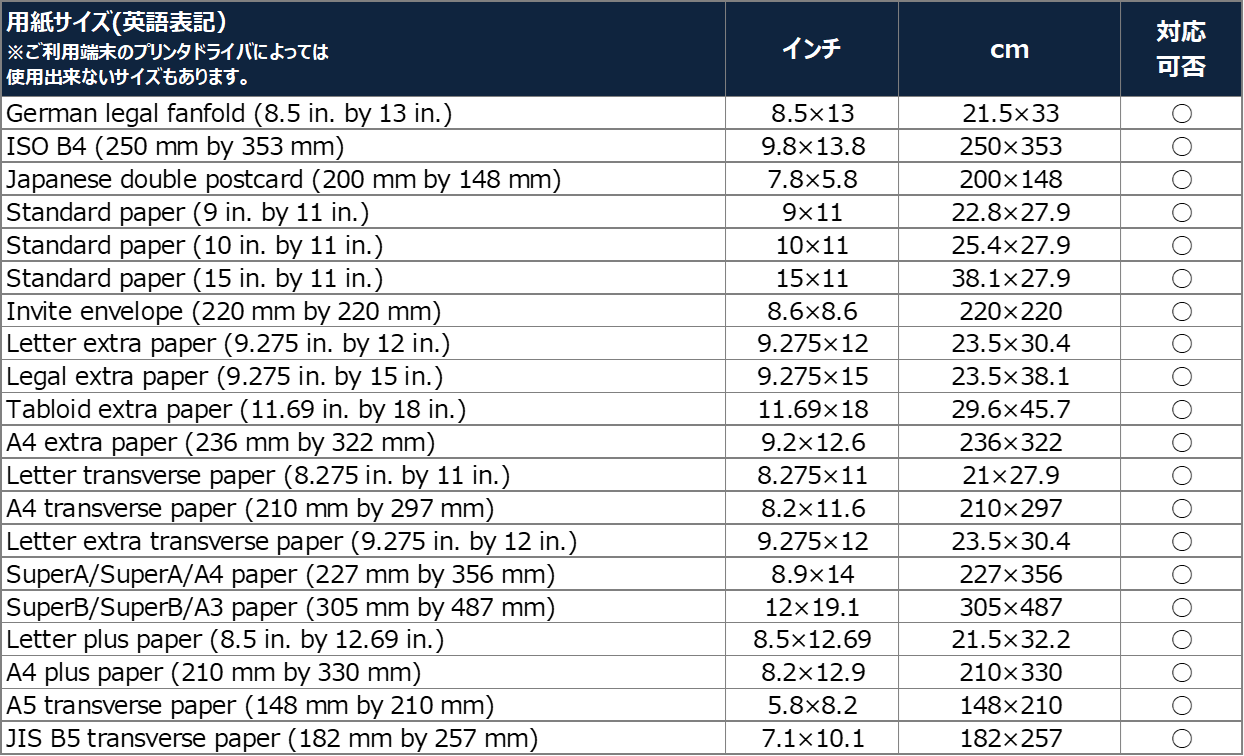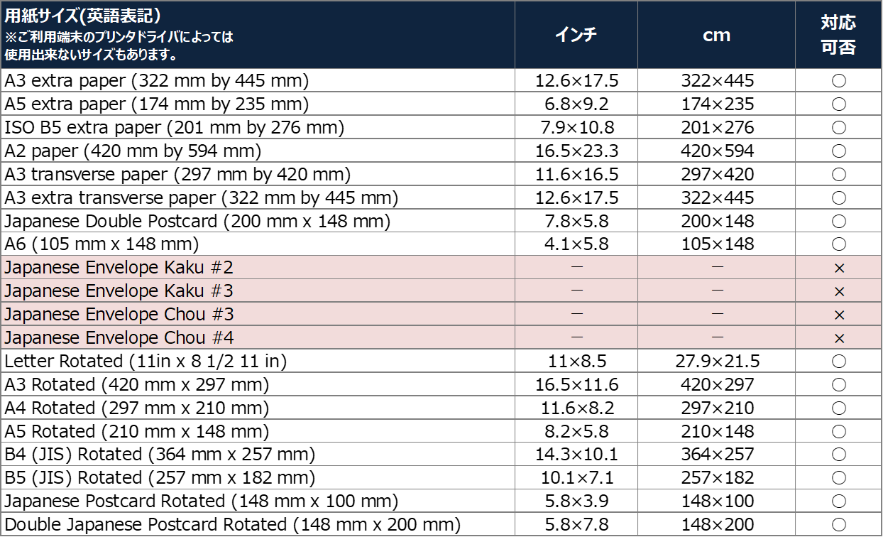 ユーザー定義の用紙サイズは未対応です。 下記一覧に表記のない用紙サイズは未対応です。