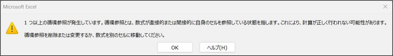 循環参照とは、計算結果を表示するセルに数式が入ったセル自身を入れてしまった場合や、その値に依存するセルを入れてしまった場合に起こるエラーのことです。 Excel定義ファイルをいた際に「ご注意ください。 ブックに循環参照が見つかったため、数式を正しく計算できない可能性があります。」のメッセージが表示されます。