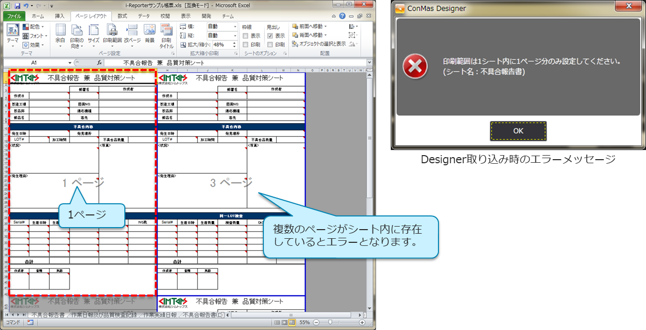 シート内に2ページ目以降が設定されていた場合、ConMas Designer取り込み時にエラーとなり、取り込むことができません。