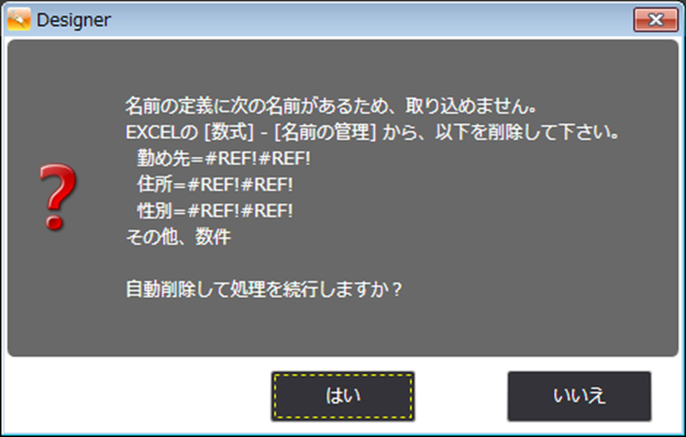 「名前の定義」の値・参照範囲に不正な設定のあるExcelファイルを取込んだ際、ConMas Designer上で以下のメッセージが出る場合があります。