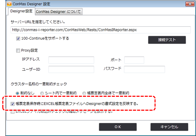 ConMas Designer の設定: どちらでも構いません。Excel帳票定義にConMas Designerの書式設定を反映しておきたい場合は「反映する」にチェックしてください。
