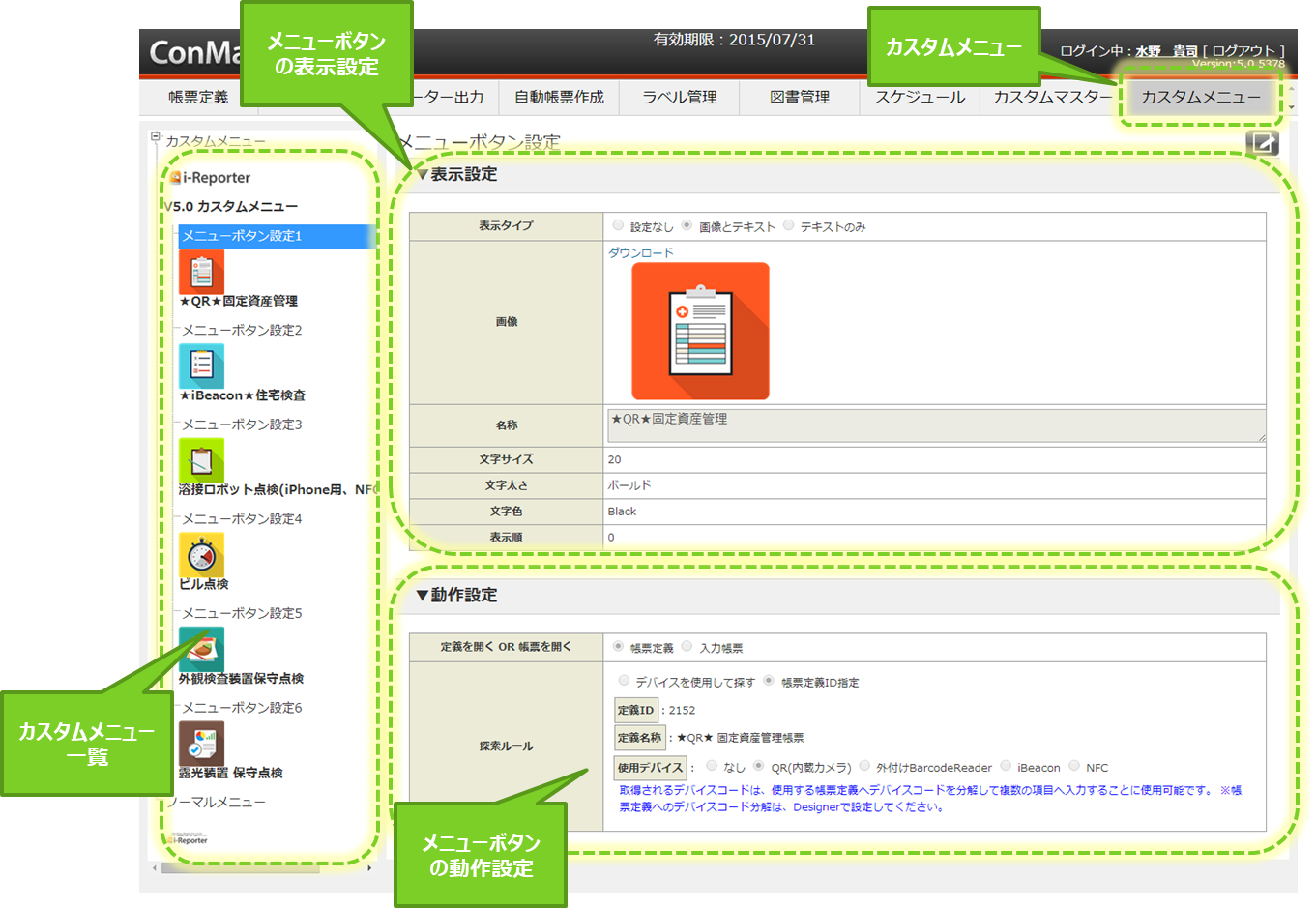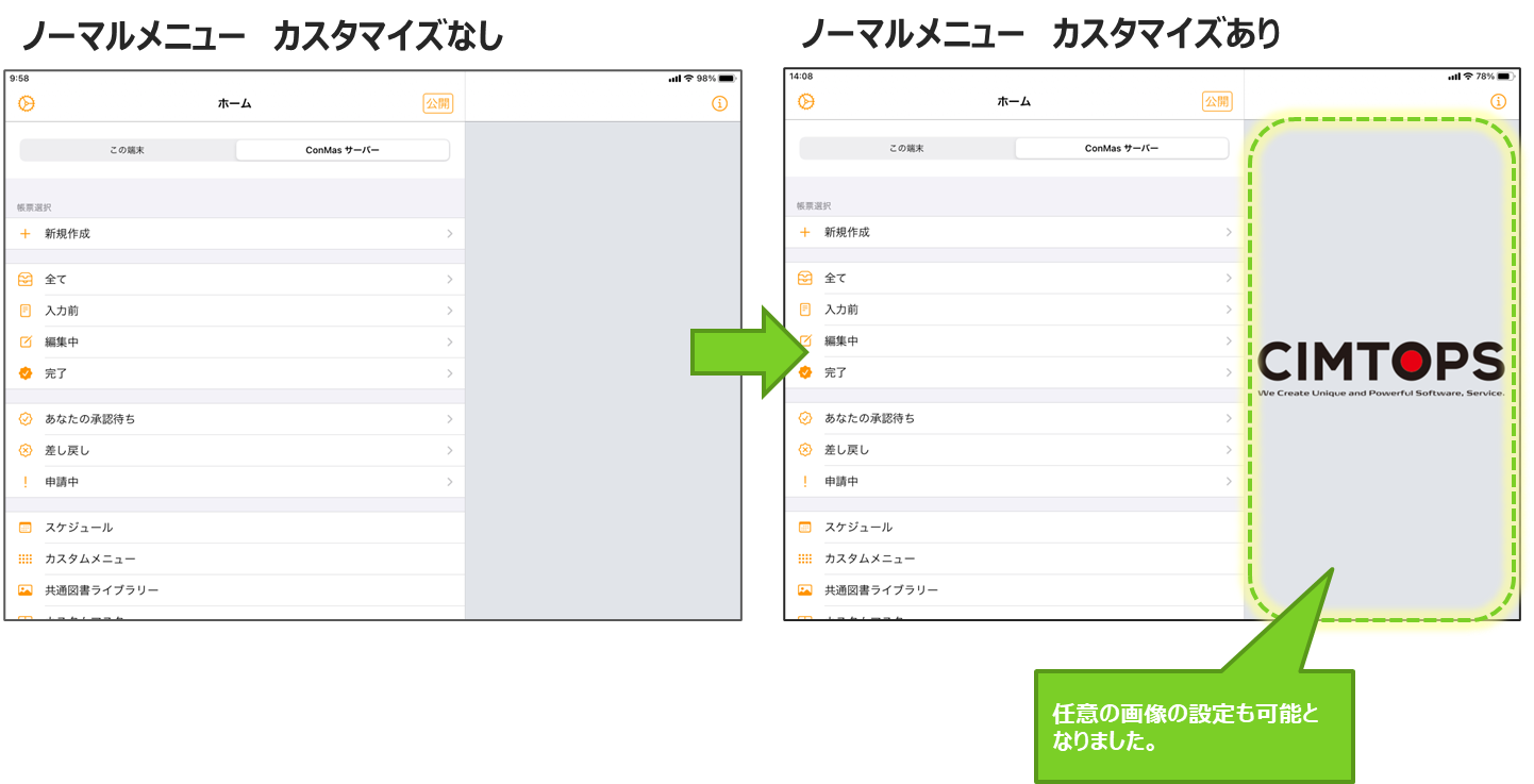 カスタムメニューは、ConMas Managerにおいて、ユーザー自身で作成登録することができます。 ConMas Managerで作成、変更されたカスタムメニューは、iPad,iPhoneでのログイン時に自動で配信されます。