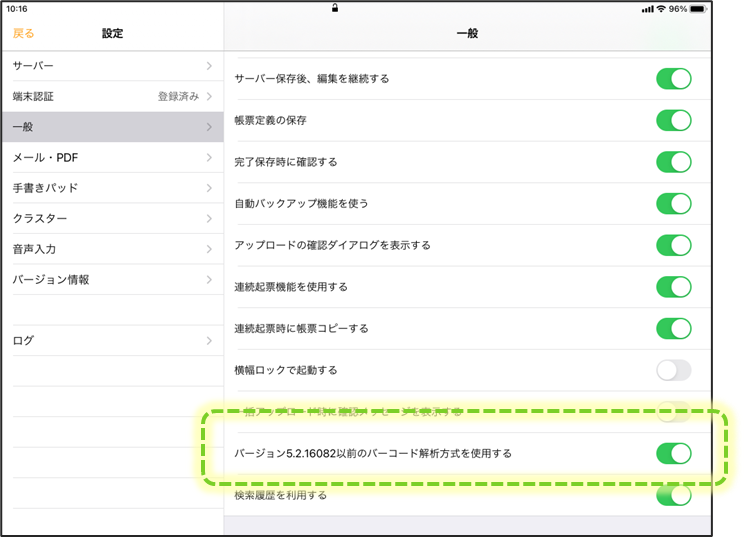 UPC-A、Codabarをご利用の場合は、i-Reporterアプリの一般設定にて、 「バージョン5.2.16082 以前の解析方式を使用する」を選択してください。