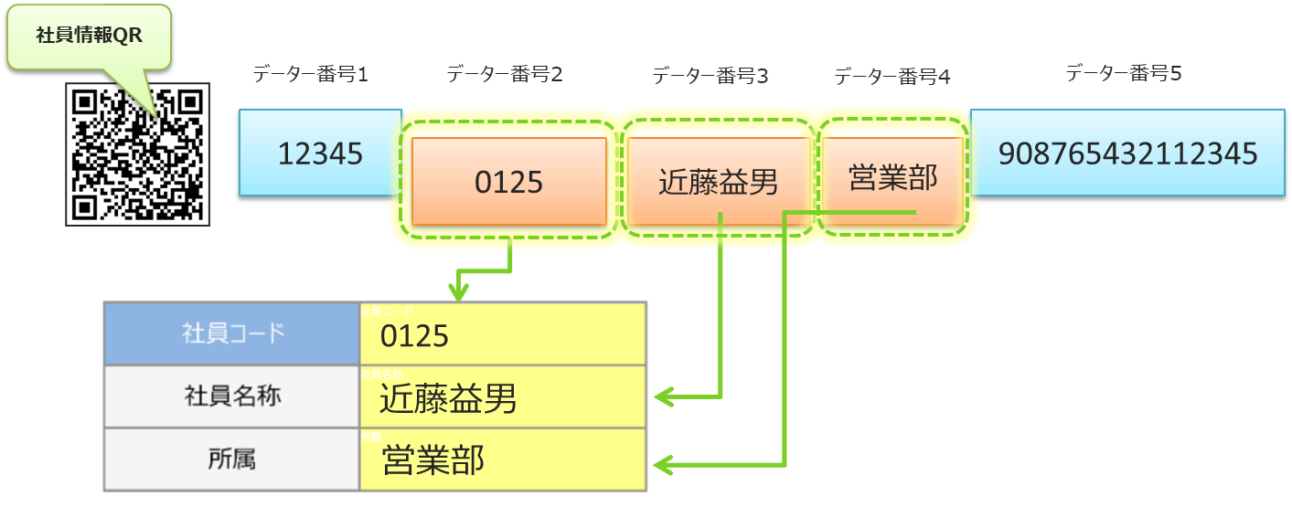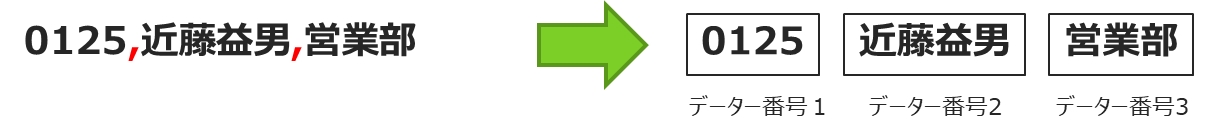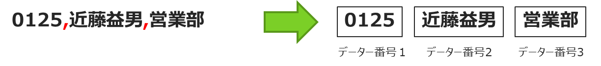 カンマ区切り コードデータを予め”,”(カンマ)で区切っておく事でデータを分解します。