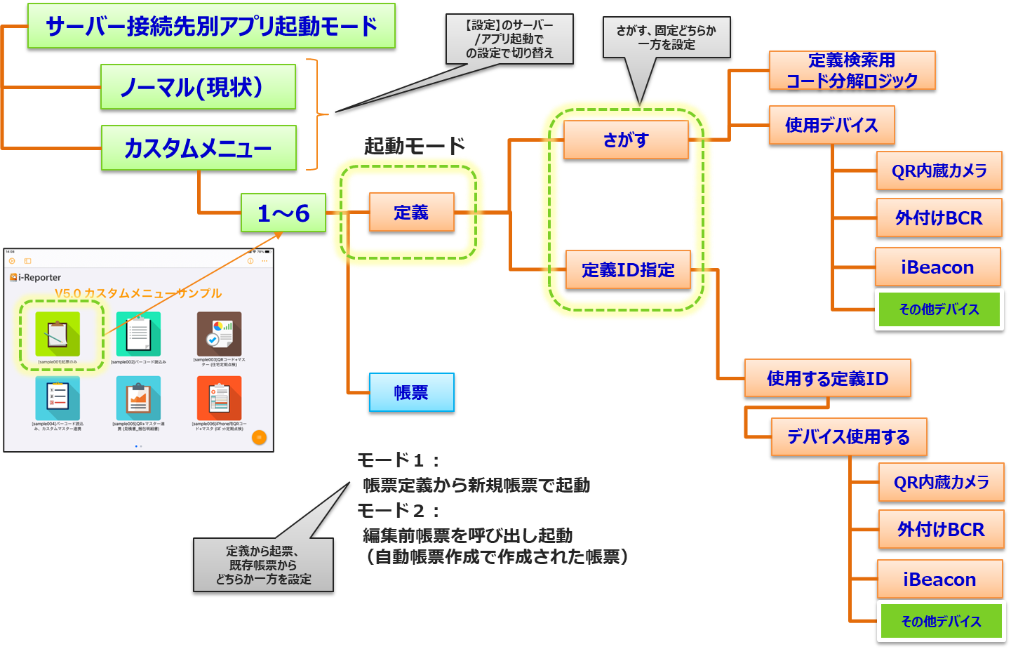 デバイスが読み取るコードの一部から帳票定義を見つけて起動