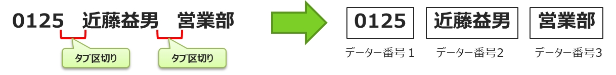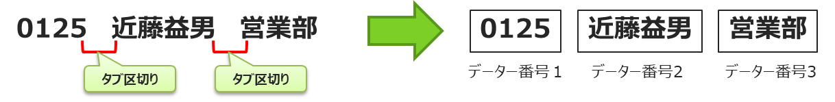 タブ区切り コードデータを予めタブで区切っておく事でデータを分解します。
