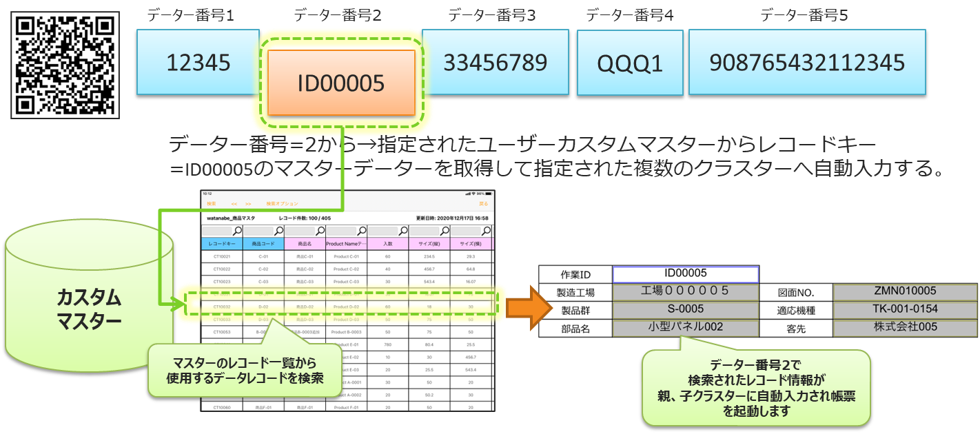 ② デバイスが読み取るコードを分解して、カスタムマスターのレコードキーと連携して複数のクラスターへ自動入力
