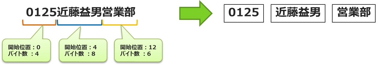 バイト指定区切り 区切りの無いコードデータに対して開始バイト位置とバイト数を指定しておき、該当箇所のデータを抜き出します。