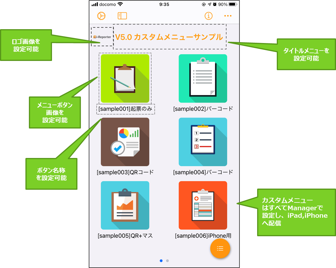 i-Reporterアプリ専用のカスタムメニューを自由に設定できます。 ※下図はiOS版アプリの画面例です。
