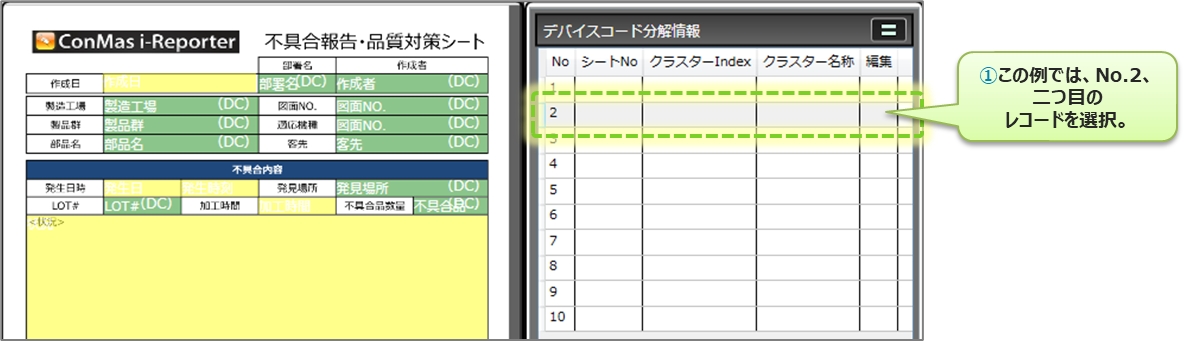「デバイスコード分解情報」グリッドのNo.1~100のレコードの内、入力先のクラスターを設定するレコード行を先に選択します。
