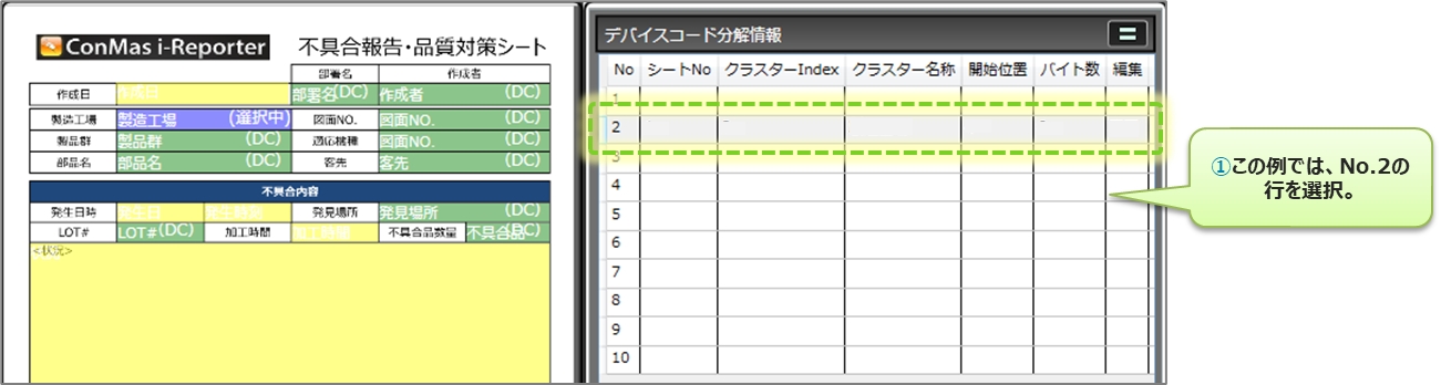 「デバイスコード分解情報」グリッドのNo.1~100のレコードの内、入力先のクラスターを設定するレコード行を先に選択します。 「バイト数指定区切り」の場合は、行NO.はどこでも構いません。