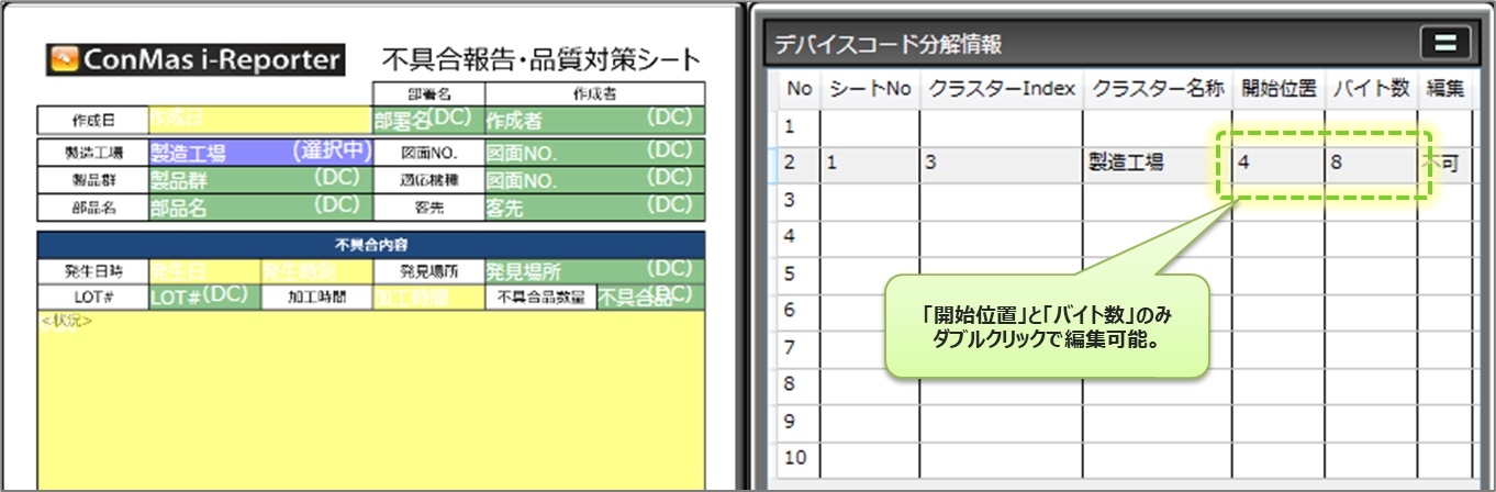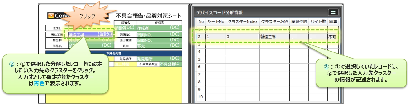 ConMas Designerでは、デバイスを使用して読み取ったデバイスコードを各クラスターに分解 して自動入力する設定を行います。 この時、カスタムマスターを使用した入力の設定も可能です。
