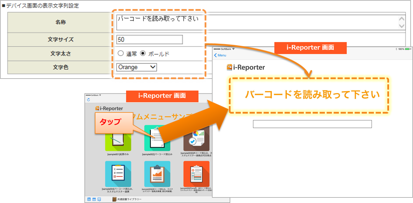 デバイスコードを読みとるデバイスが 「外付けBarcodeReader」、「iBeacon」場合、i-Reporter 上に表示されるデバイスコードを読み込み画面に文字列を表示することができます。 この文字列を設定します。