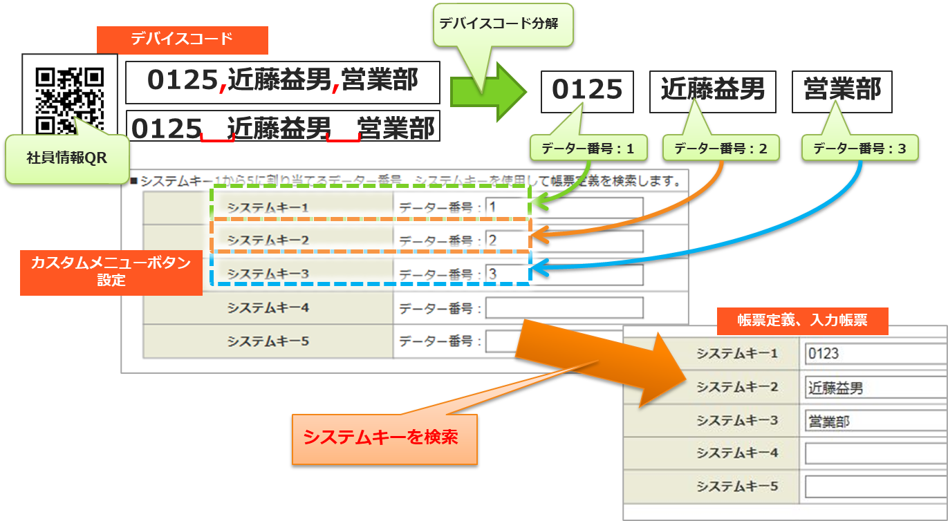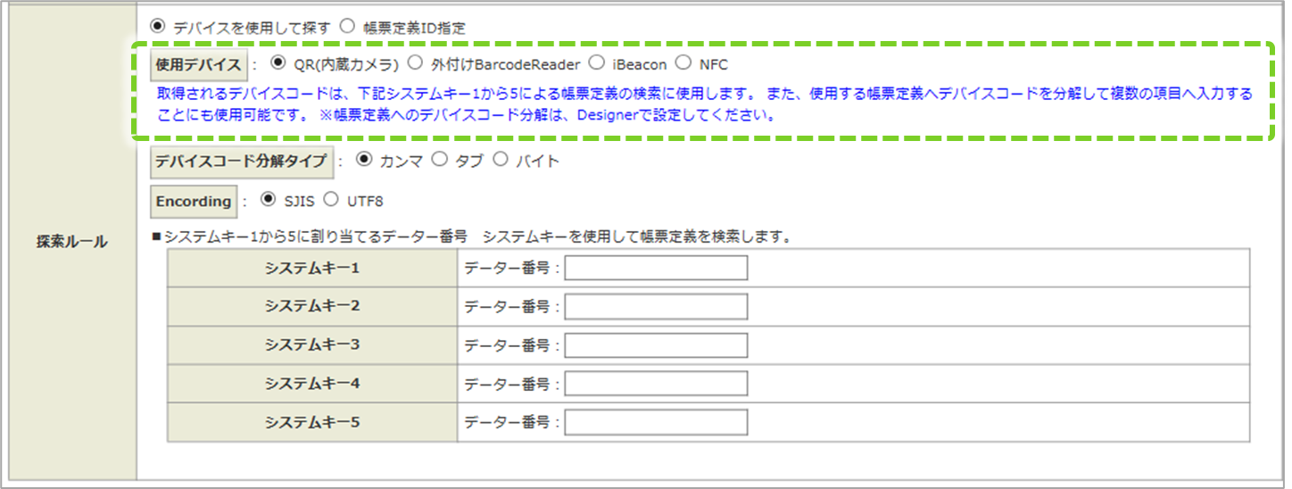 • デバイスを使用して、指定する帳票定義のシステムキーが設定されているデバイスコードを読みとり、システムキーから帳票定義、入力帳票を探す方法です。